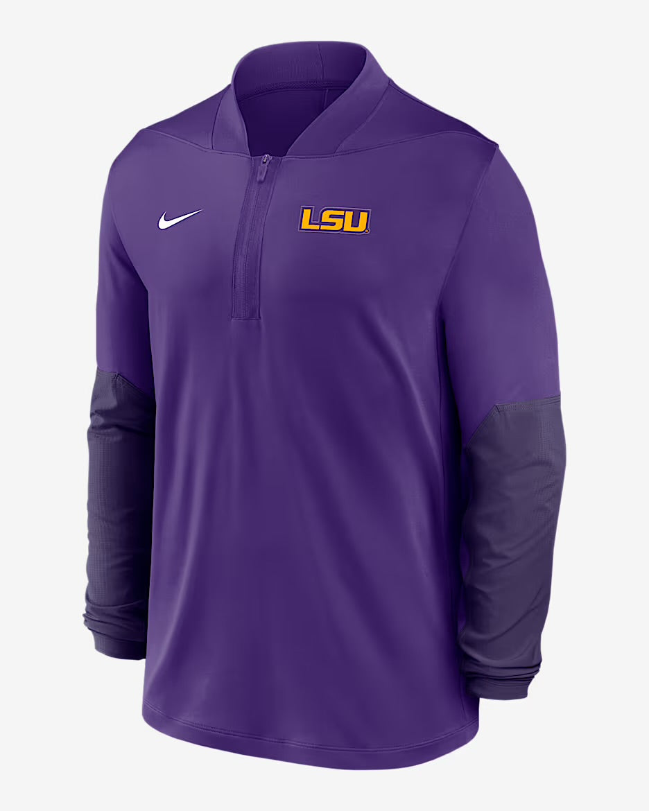 This LSU Men's Nike DF Half Zip LS Top in purple is a stylish and functional athletic piece. The half zip design allows for easy temperature control while the long sleeves provide extra coverage. The Nike brand ensures quality and the Dri-FIT technology wicks away sweat for a comfortable and dry workout.