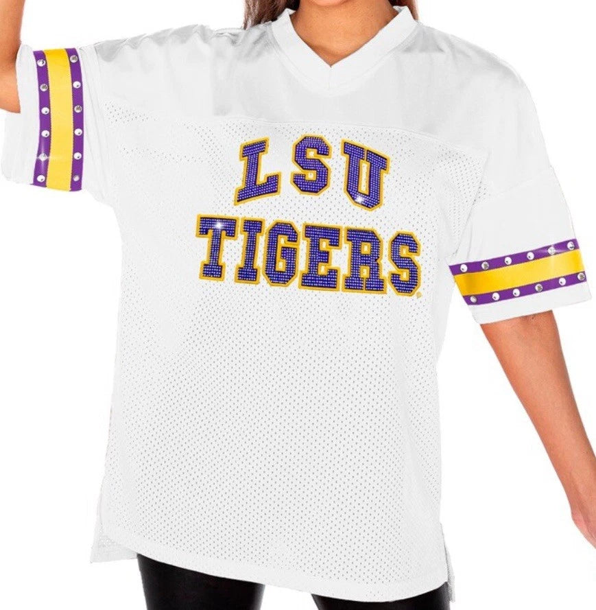 Show your LSU pride in style with the LSU Tigers Until Kickoff Oversized V-Neck Fashion Jersey. Featuring a relaxed fit and a distinctive rhinestone-striped trim, this jersey blends comfort with eye-catching detail. Its oversized design offers easy layering and a trendy silhouette, perfect for game day or casual wear. Crafted to stand out, it’s an expert choice for fans seeking both fashion and team spirit in one versatile piece.