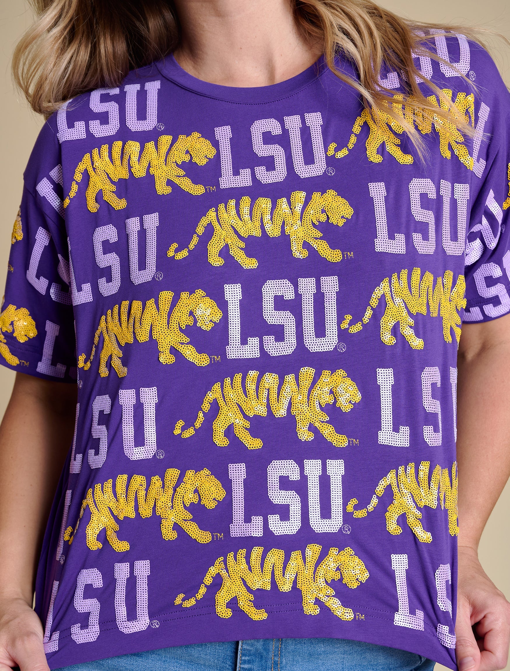 This LSU and tigers-featured Sequin Repeat Tee is a must-have for any fan. Made from high-quality materials, it offers both comfort and style. Show off your team pride in a unique way with the sequin design. Perfect for game day or everyday wear.